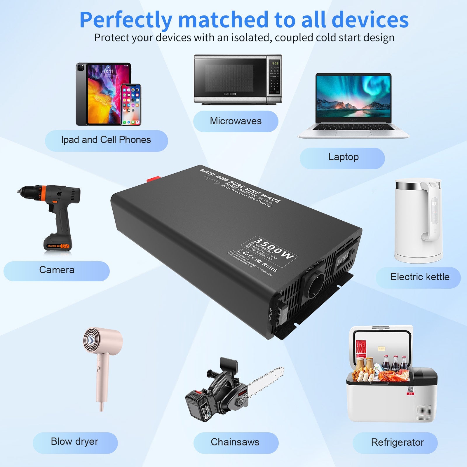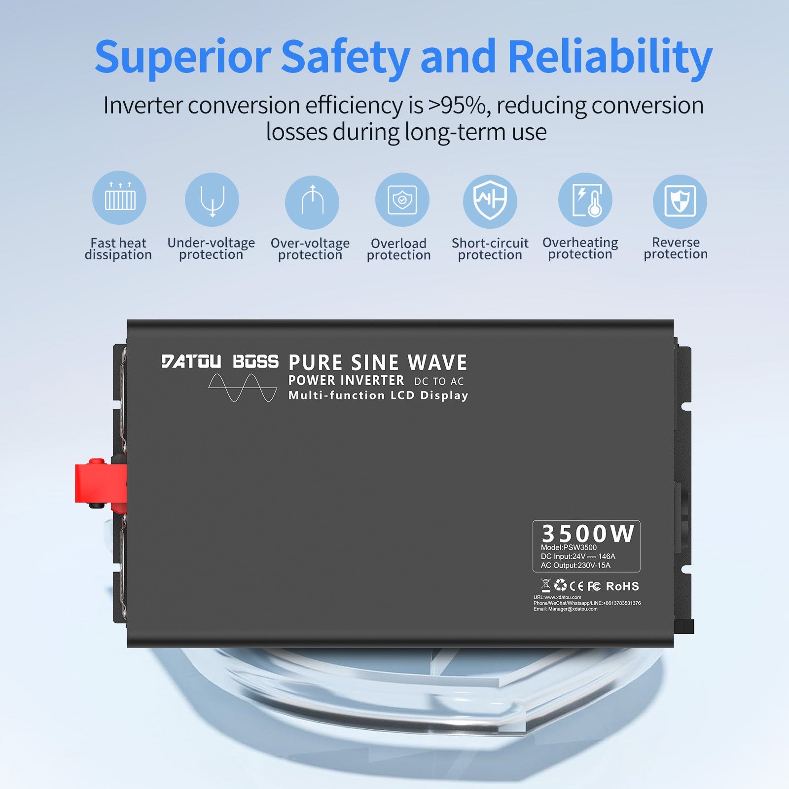 Upgrade to the Datouboss 3500W Pure Sine Wave Inverter and experience the peace of mind that comes with knowing your power supply is reliable and efficient.
